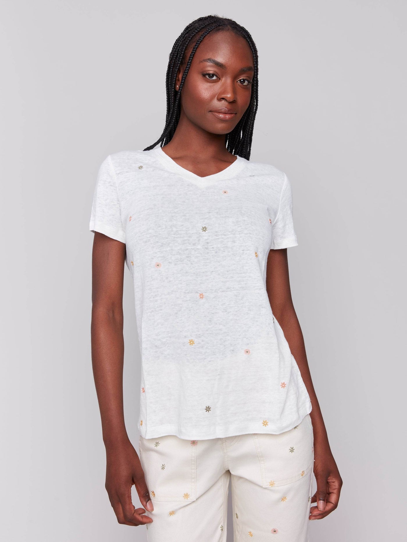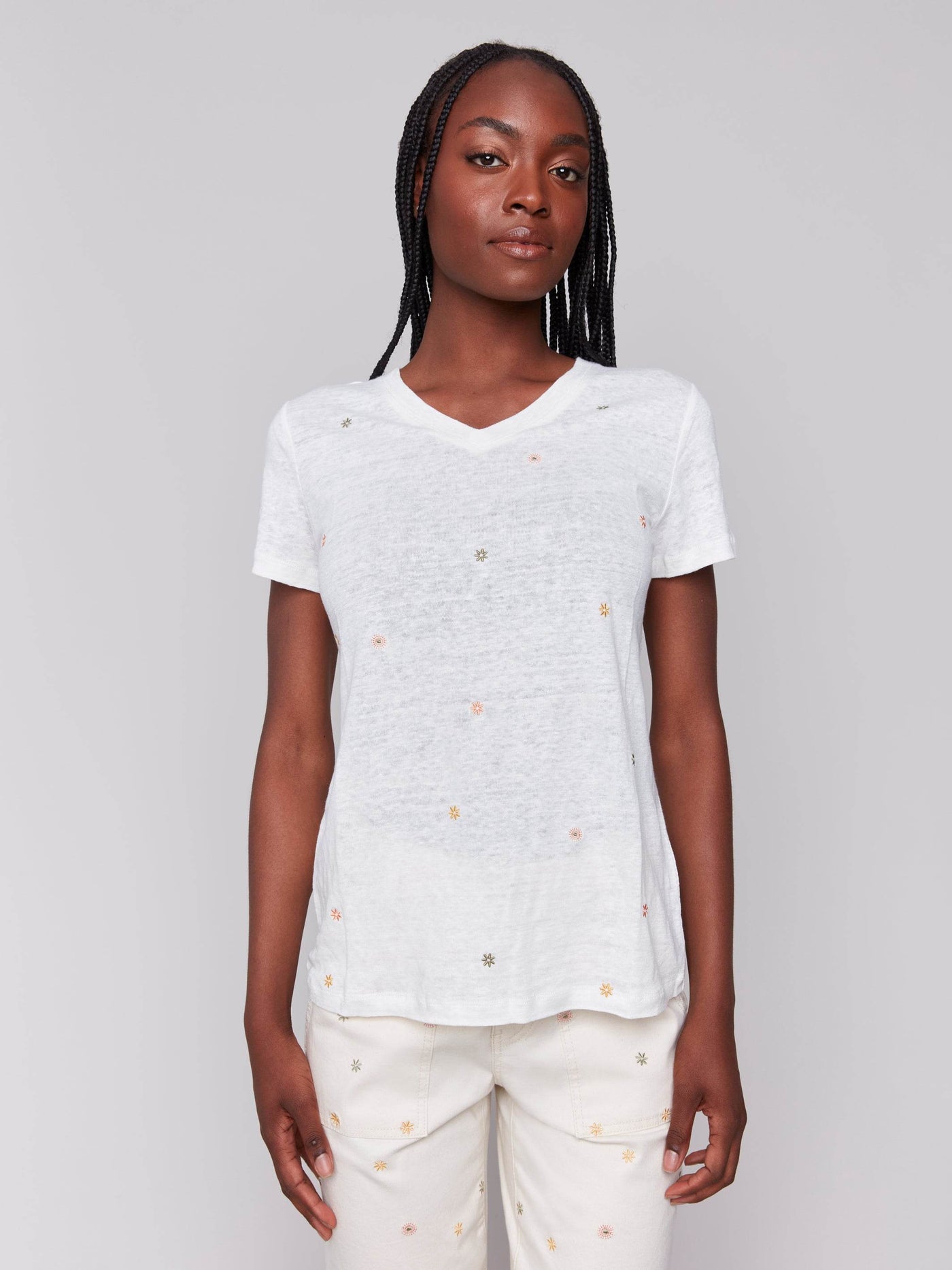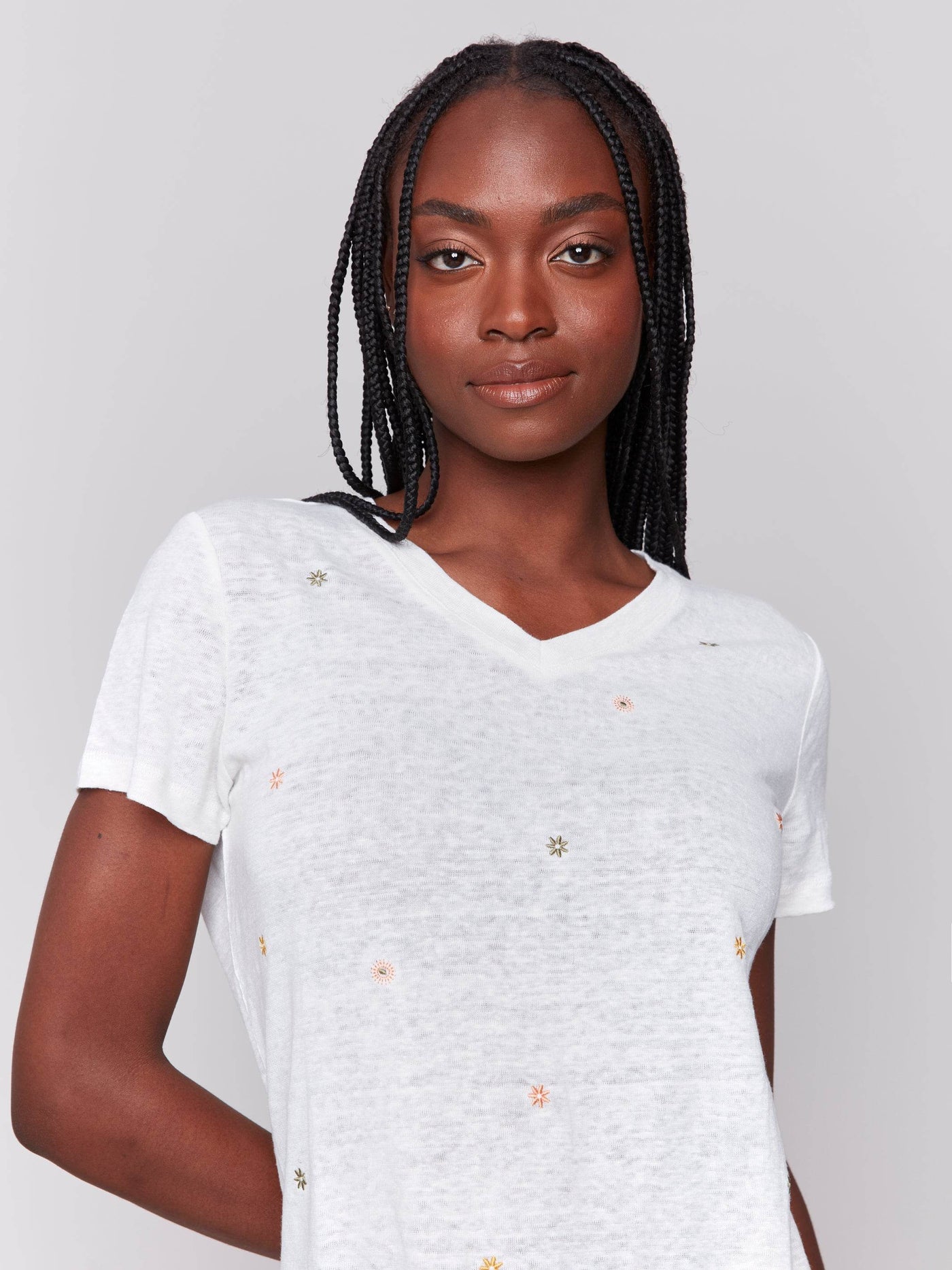 Effortlessly chic and stylish, this Short Sleeve V-Neck T-Shirt features intricate floral embroidery that adds a touch of femininity to your wardrobe. The soft, breathable fabric makes it perfect for any occasion, keeping you comfortable and looking great all day long. With its versatile design and elegant details, it's the perfect addition to your collection. Indulge in luxurious comfort and style with this must-have T-Shirt!