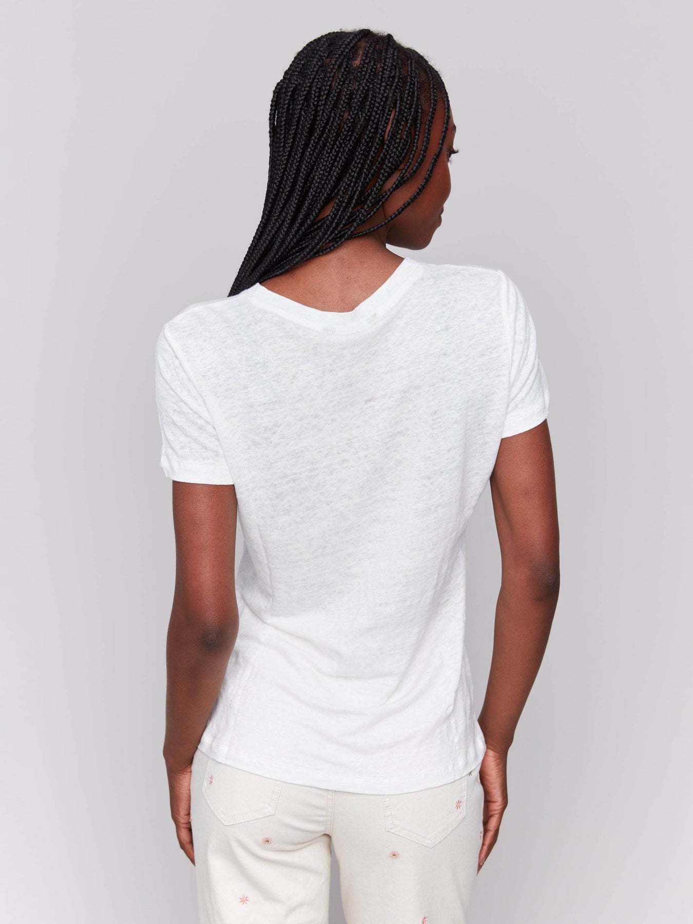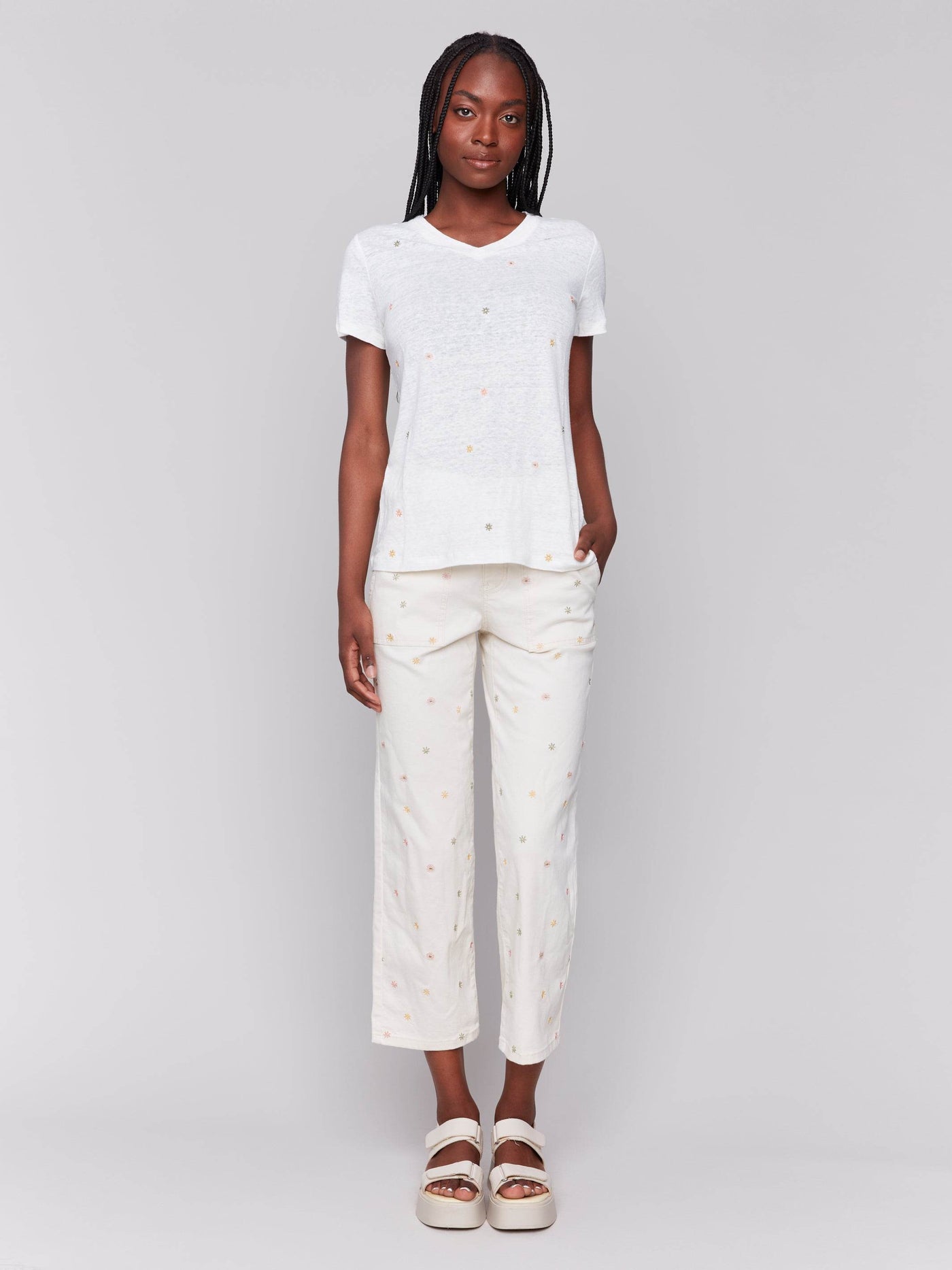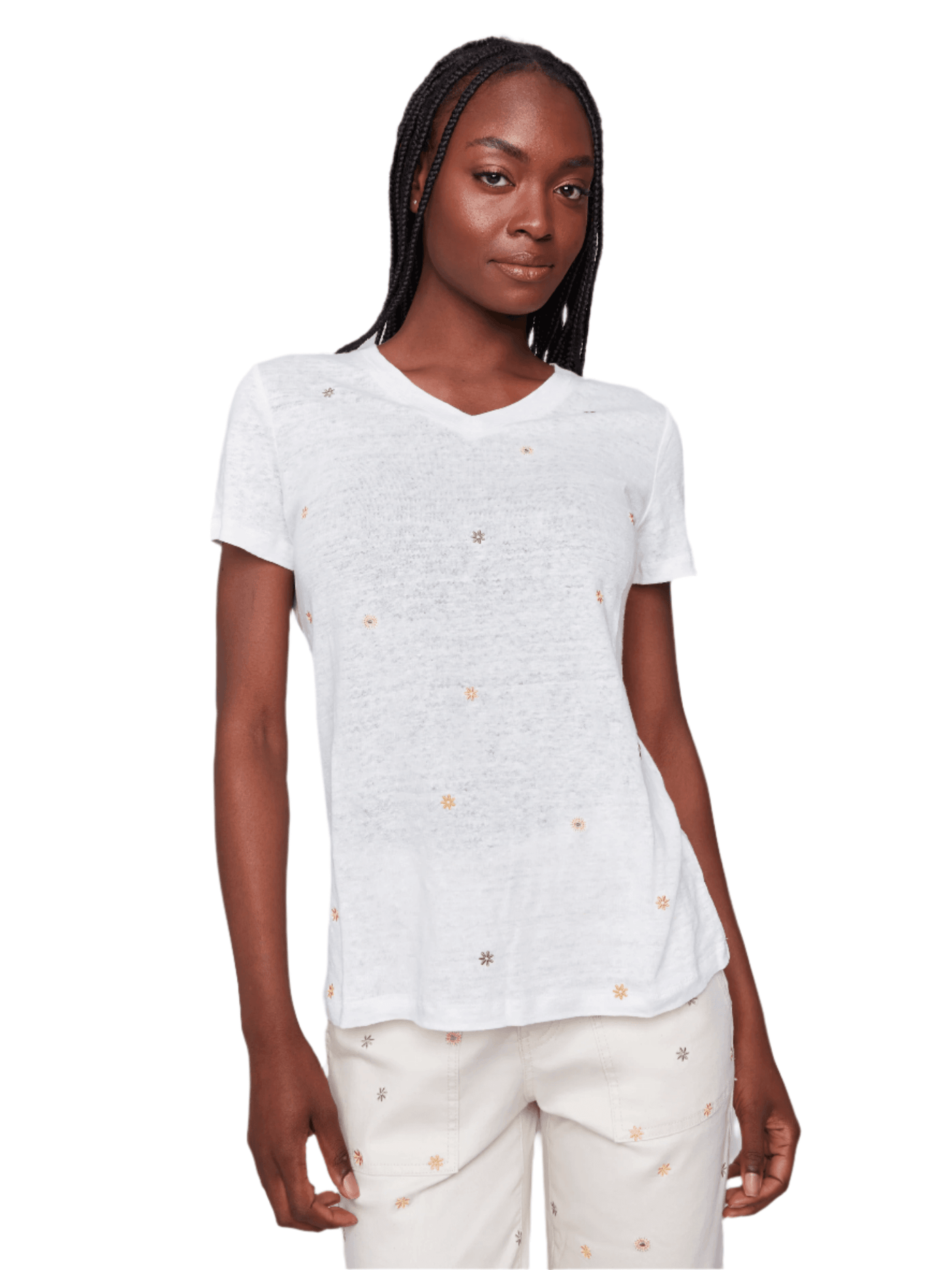 Effortlessly chic and stylish, this Short Sleeve V-Neck T-Shirt features intricate floral embroidery that adds a touch of femininity to your wardrobe. The soft, breathable fabric makes it perfect for any occasion, keeping you comfortable and looking great all day long. With its versatile design and elegant details, it's the perfect addition to your collection. Indulge in luxurious comfort and style with this must-have T-Shirt!