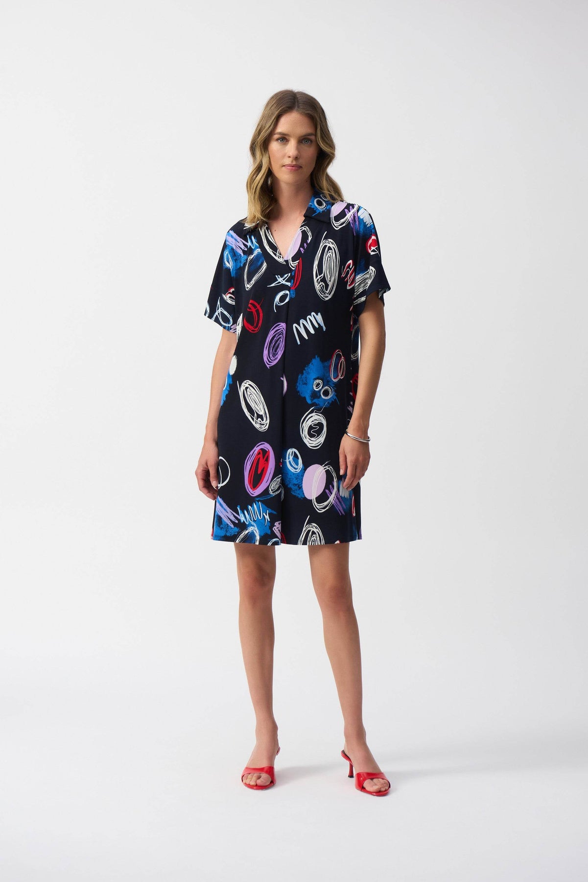 Experience the captivating charm of this luxurious knit dress. The graceful A-line style flows gracefully and enhances the silhouette beautifully. An eye-catching abstract print decorates the material, providing a striking appearance. The short dolman sleeves and shirt collar add a touch of sophistication to this exceptional ensemble.