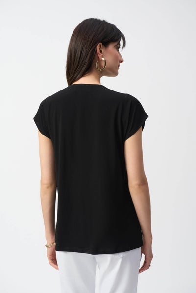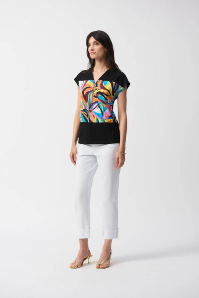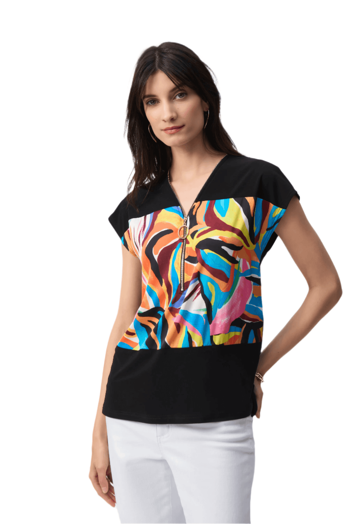 Showcase your magnetic personality in this vibrant abstract print top. Cut from silky knit and printed satin, this unique top offers short raglan sleeves, and a zippered v-neckline. Side slits complete this casual piece.