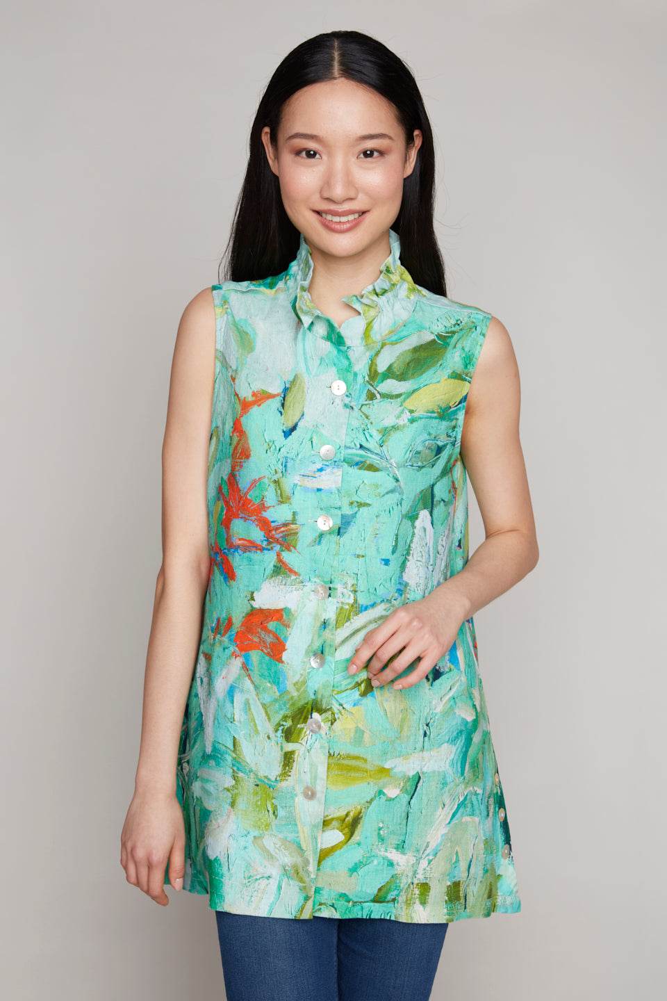 A wearable work of art, this sleeveless tunic brings vibrant color and effortless elegance to your wardrobe. Featuring a stunning watercolor-inspired floral print in pink, green, and blue hues, this button-front design offers a breezy, flattering fit. Perfect for warm days or layering, it pairs beautifully with white pants or your favorite denim for a fresh, sophisticated look.