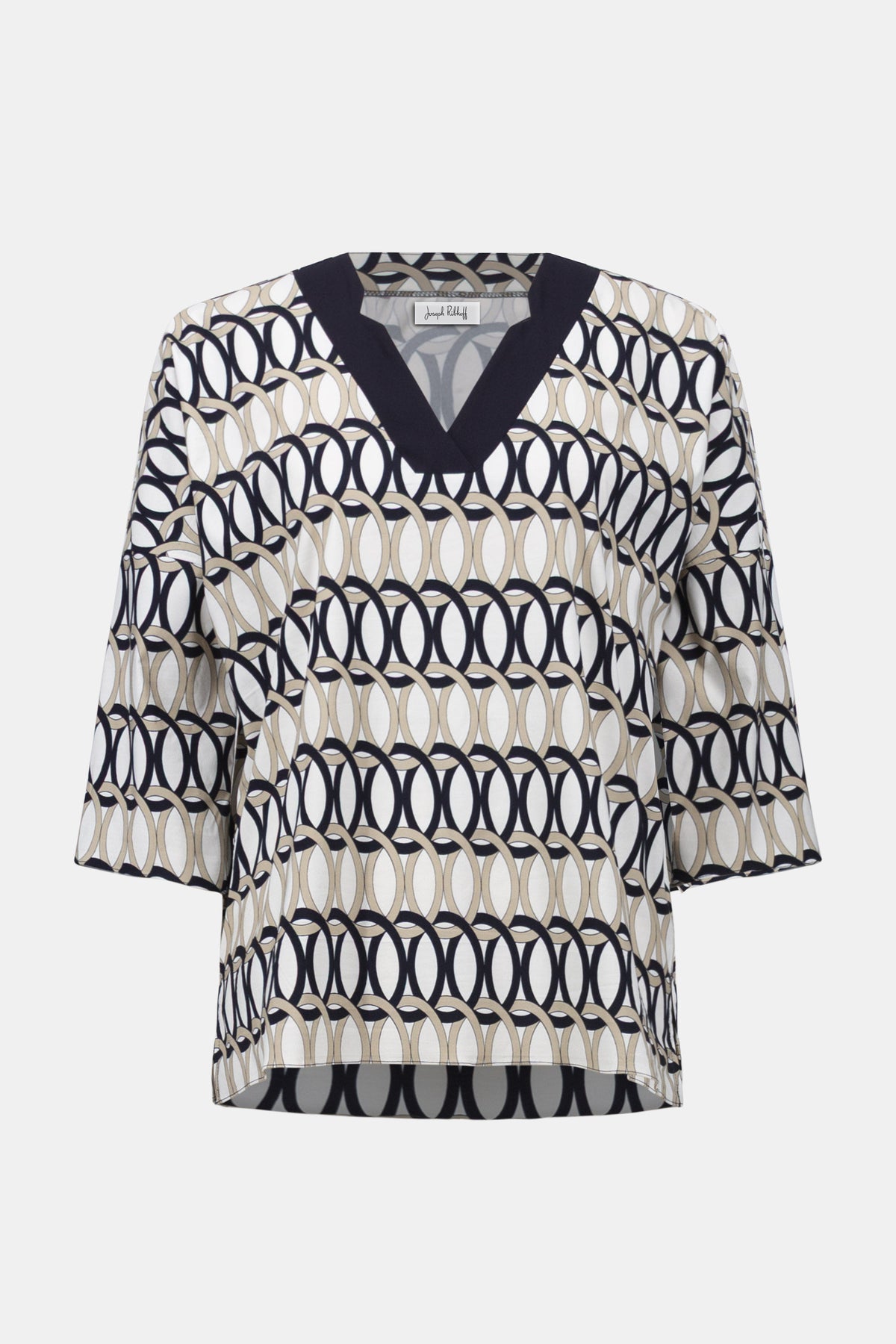 Airy and bold, this straight tunic pairs geometric printed poplin with soft georgette. Designed with a contrast V-neckline, three-quarter dolman sleeves, and side slits for relaxed movement.