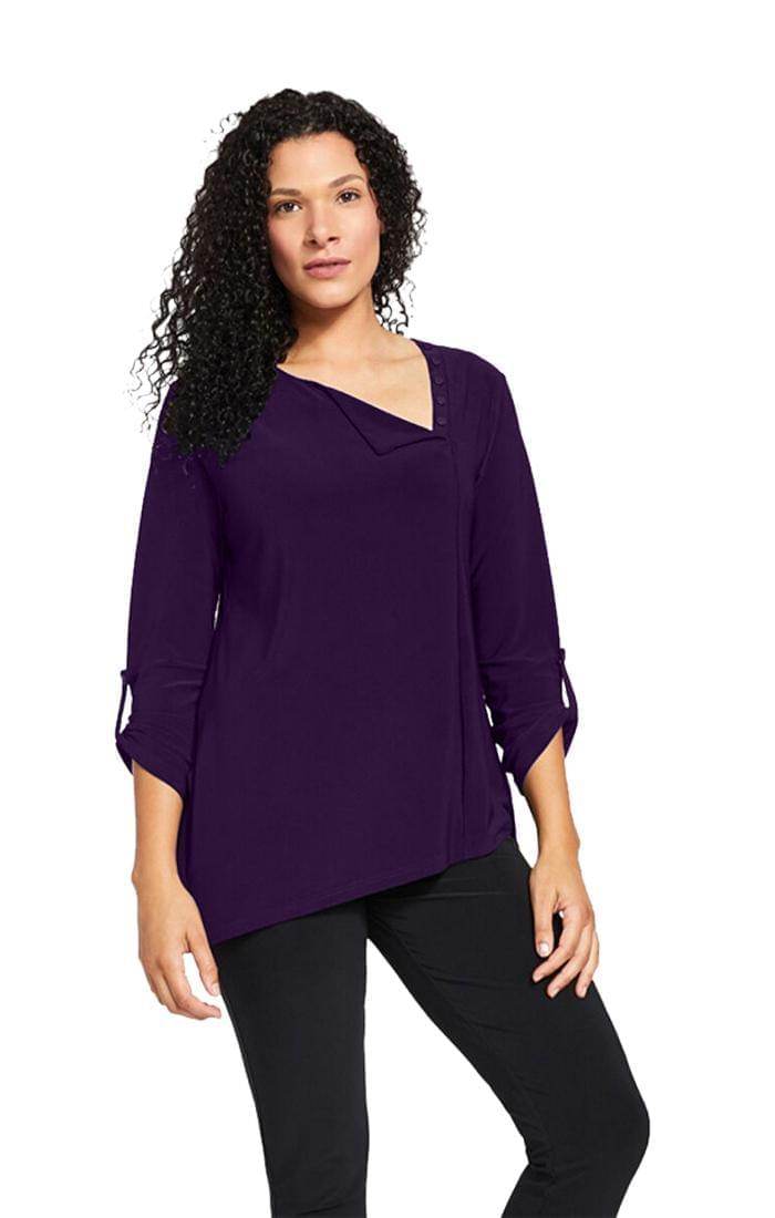 The Sympli Icon Flop Top, Style 22206-3, is a fun and versatile top for your wardrobe. Features a flopped collar with buttons, a nice diagonal hemline, and cuffed sleeves.