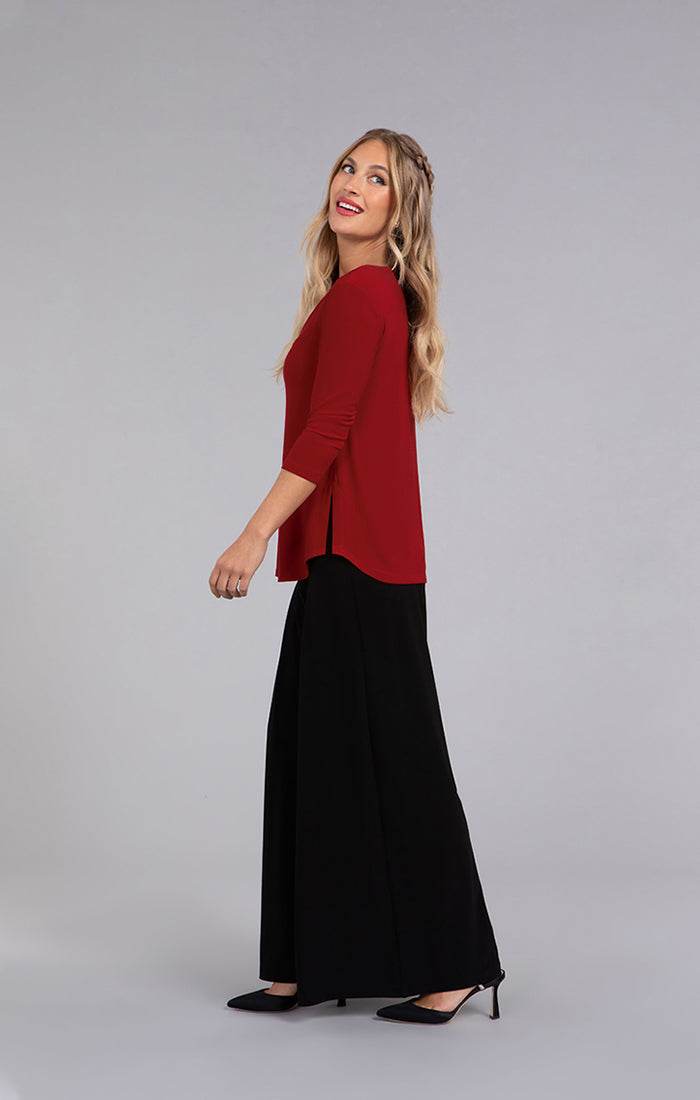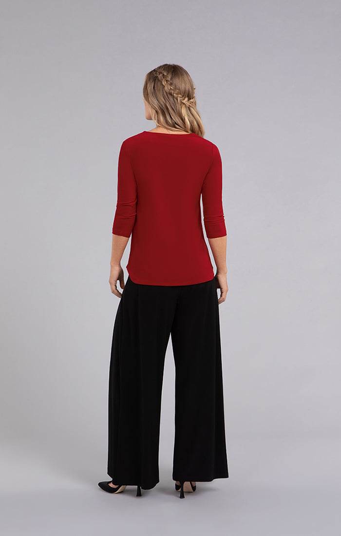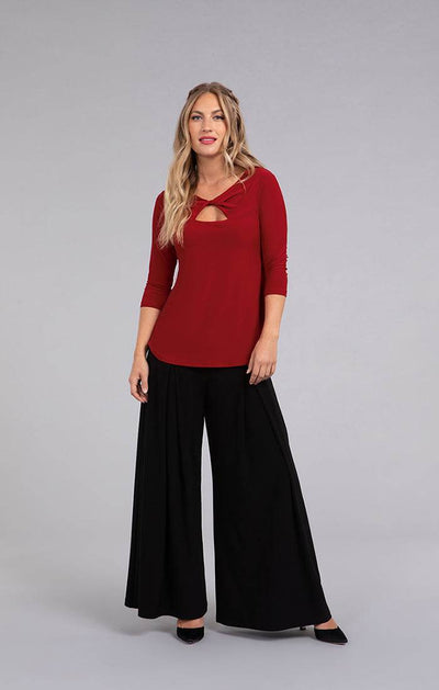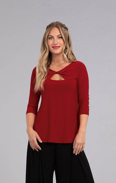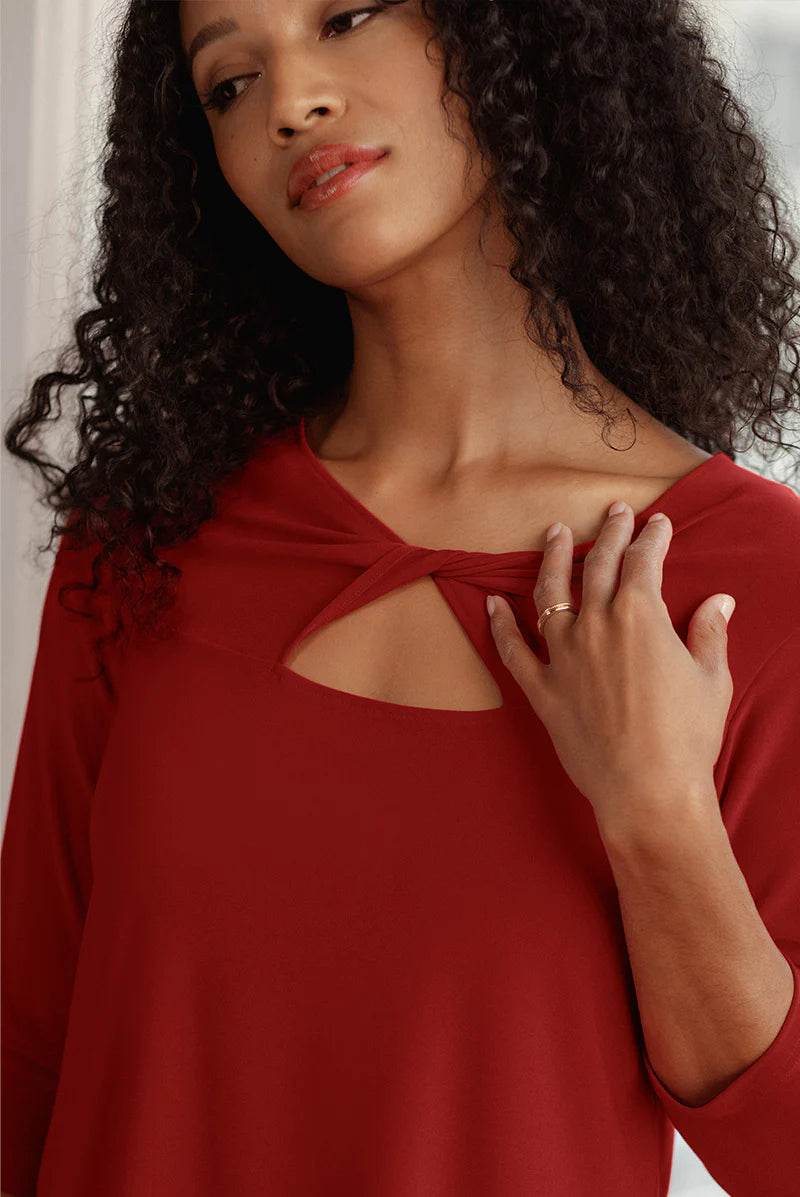 The Twist Top brings a playful edge with its distinctive triangular front cutout, especially striking in vibrant red. Designed with a shirttail hem and side slits, it offers both style and comfort, complemented by flattering 3/4 length sleeves.