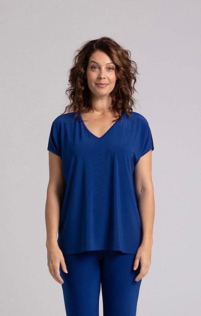 Experience unparalleled comfort and sophistication with this effortlessly elegant top. Crafted for a loose fit like your go-to t-shirt, it surpasses the ordinary with carefully curated accents that elevate it from basic to extraordinary. Embrace unmatched ease, making a subtle impression in this relaxed top - ensuring both utmost comfort and effortless style. The delicate cap sleeves provide a flattering silhouette, enhanced by small slits along the side seams that add a touch of refinement. Matching jersey binding completes the polished finish.