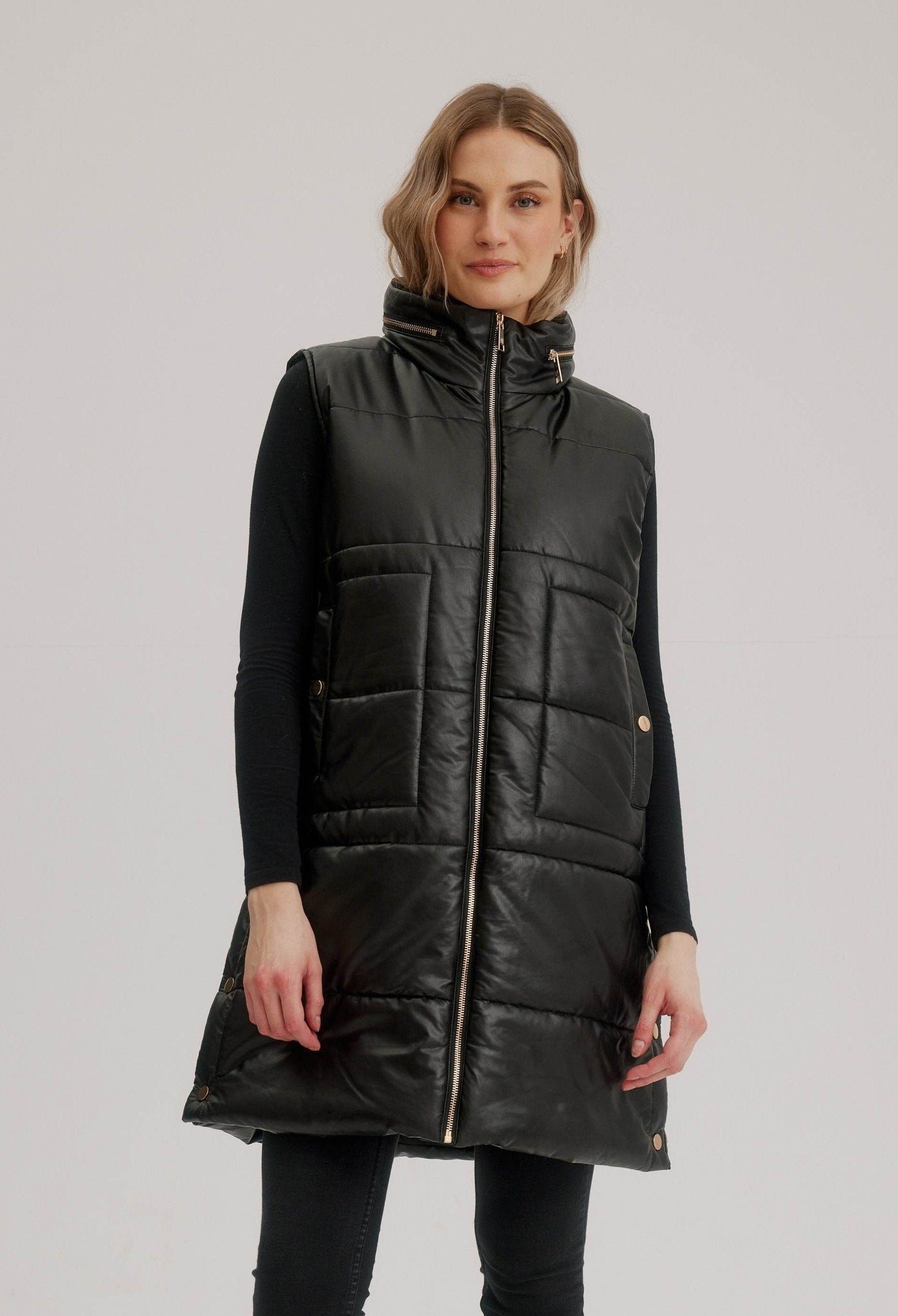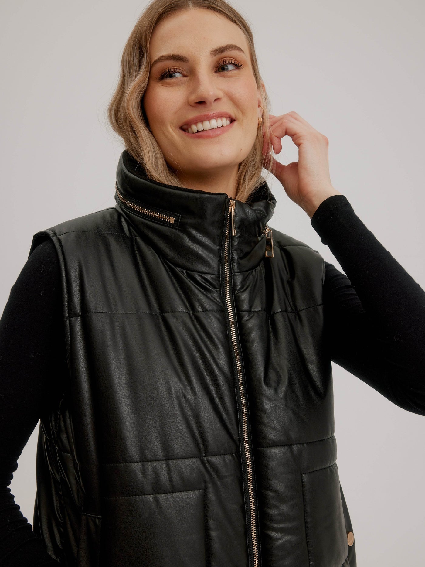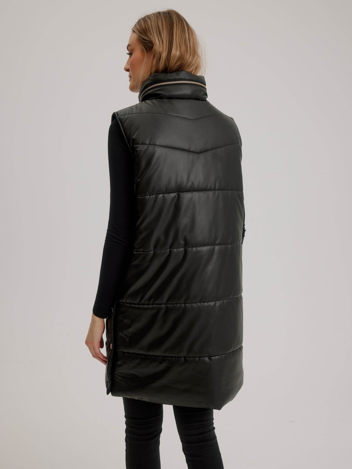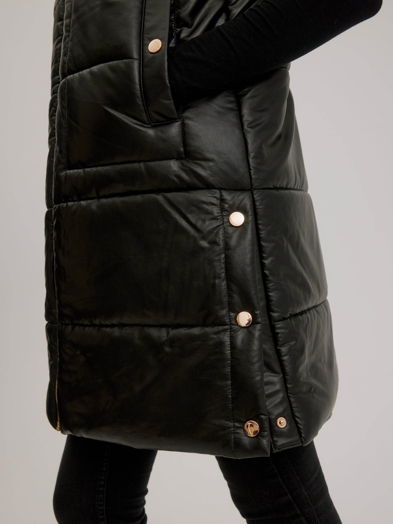 Look trendy and sophisticated with this vegan leather quilted vest featuring gold trim and side snaps. Crafted with a zipper closure and two side pockets, this vest is a must-have to complete your wardrobe. It has a 36" length for superior coverage and comfort.