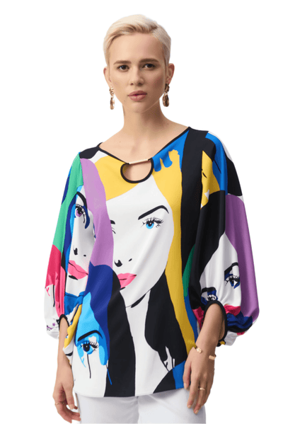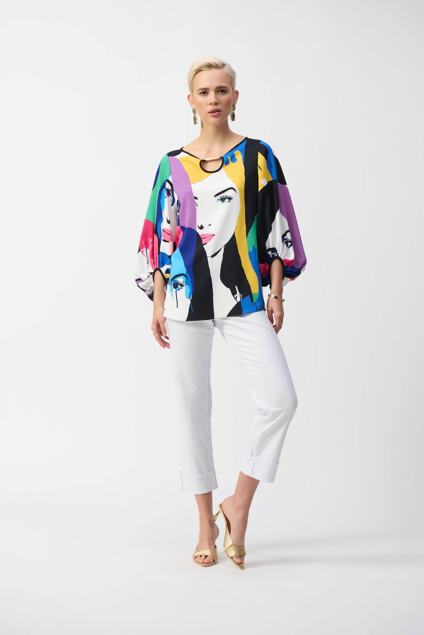 This top boasts a captivating face print, showcasing bold and modern design. The boxy fit brings a touch of casual elegance to the overall look. With puffed three-quarter sleeves accented by black trims and a striking keyhole neckline adorned with a gold ornament, this garment exudes perfection and glamour.